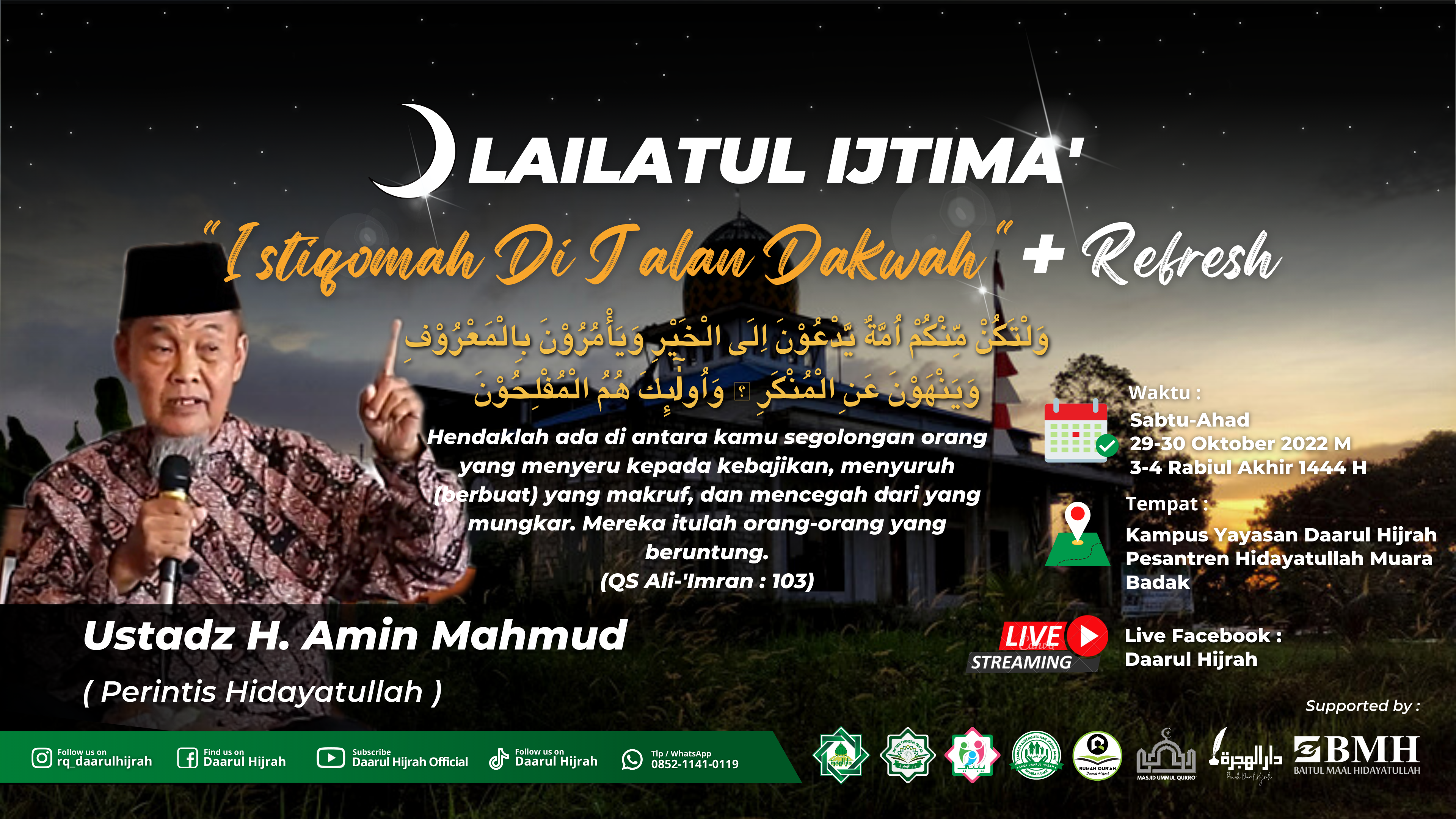 Dalam Lailatul Ijtima’ Hidayatullah Muara Badak, Ustadz Amin Mahmud, salah seorang Perintis Hidayatullah berpesan bahwa Perjuangan memerlukan Istiqamah agar bernilai di hadapan Allah Swt. Berpegang teguh pada prinsip agar tidak terpengaruh pada ujian dan cobaan.